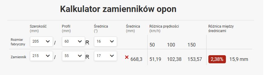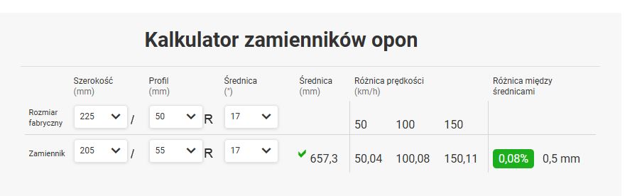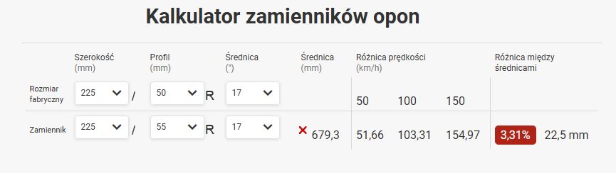 Co najważniejsze - pisałem już że w kalkulatorze wzorcową oponą do Cruze jest 205/60 r16 i to do niej trzeba porównywać zamienniki. Twoja 225/50 r 17 też już jest zamiennikiem wzorca. Jeśli za wzór będziesz dawać kolejne zamienniki zamienników to można powoli dojść do koła ciężarówki i nadal będzie na zielono wyświetlać.