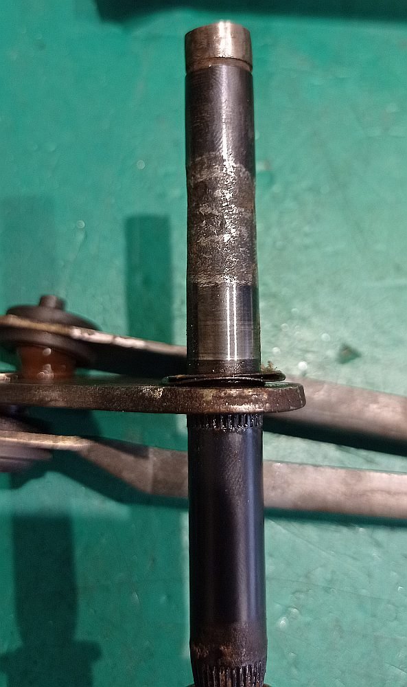 Po demontażu wyglądało to tak: Końcówka wałka została wcześniej zeszlifowana, bo na skutek prania młotkiem została nieco spęczniona i nie chciała wyjść przez tuleję.