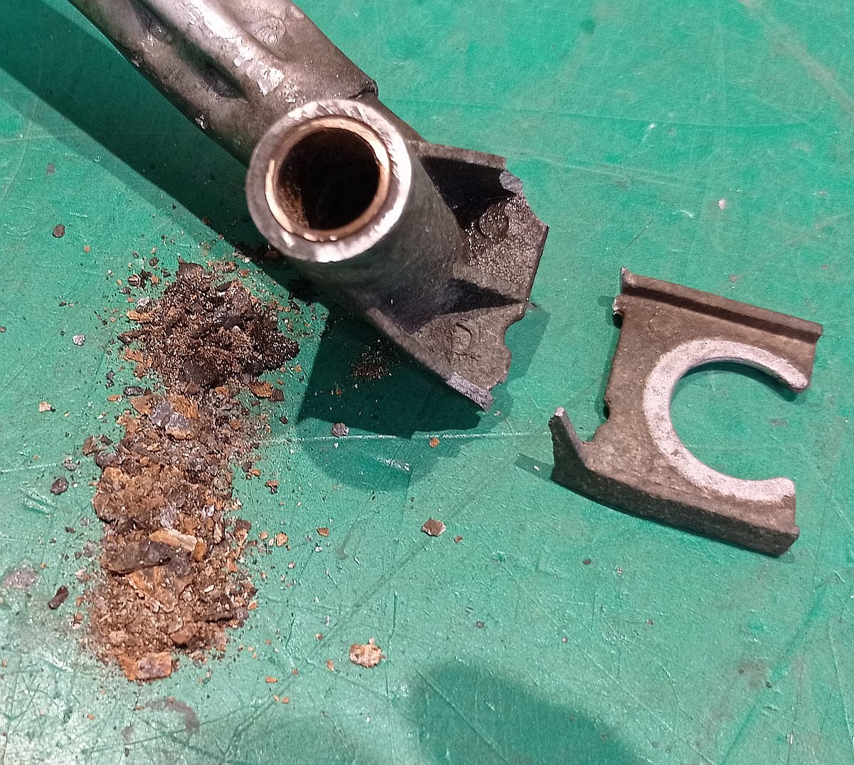W duralowej tulei są zaprasowane dwie węższe tulejki z brązu, pomiędzy którymi jest luka. To właśnie w tej przestrzeni (a nie na tulejkach) złapał wałek. Zapewne produkty jakiejś korozji miały objętość umożliwiającą zapieczenie wałka.