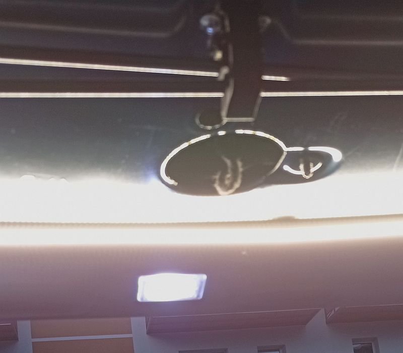 Ponieważ z tyłu było nadal ciemno, zdecydowałem się na dołożenie drugiej lampki w okolicy tylnej kanapy. Początkowo zamierzałem kupić lampkę oryginalną, ale wobec ceny 97 zł w ASO ( !!! ) zakupiłem lampkę używaną od Golfa za 10 zł i ulokowałem w podsufitce po wycięciu w niej nożykiem do papieru otworu od papierowego szablonu.
