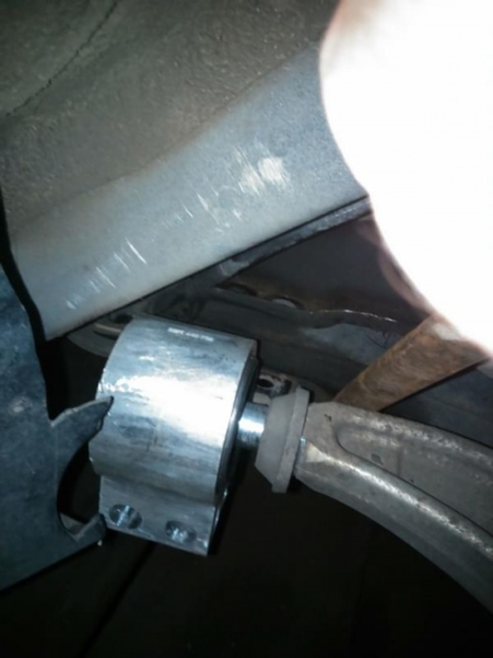 Teraz naszą dźwignię wkładamy od góry i ciągnąc do siebie robimy sobie wystarczająco dużo miejsca by zsunąć tuleją z wahacza: Trzymając tak samo zakładamy nową tuleję na wahacz. Wkładamy dźwignię od dołu i wkładamy mocowanie tulei w uchwyt podwozia. Teraz montujemy wszystkie 3 śruby i dokręcamy. Zakładamy nadkole lub jego fragment (albo wcale jeśli go już nie było), zakładamy koło i cieszymy się z szybkiej naprawy która nie zajęła nam nawet godziny. Natomiast w Oplu wycenili operację na cały dzień roboczy