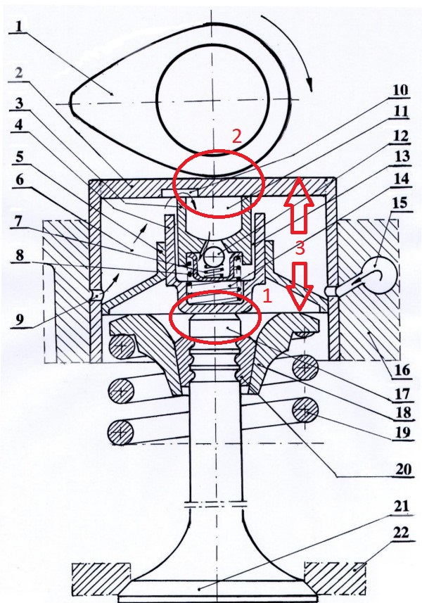 Wygląda to tak (rysunek poglądowy, nie opisuje rzeczywistego stanu budowy, a jedynie podobieństwo) zamiast wymieniać szklankę o wysokości mierzonej (3), zmniejszamy poprzez zeszlifowanie trzonka zaworu na założonej głowicy w punkcie (1) i poprzez obniżenie szklanki mamy luz odpowiedni w miejscu (2)