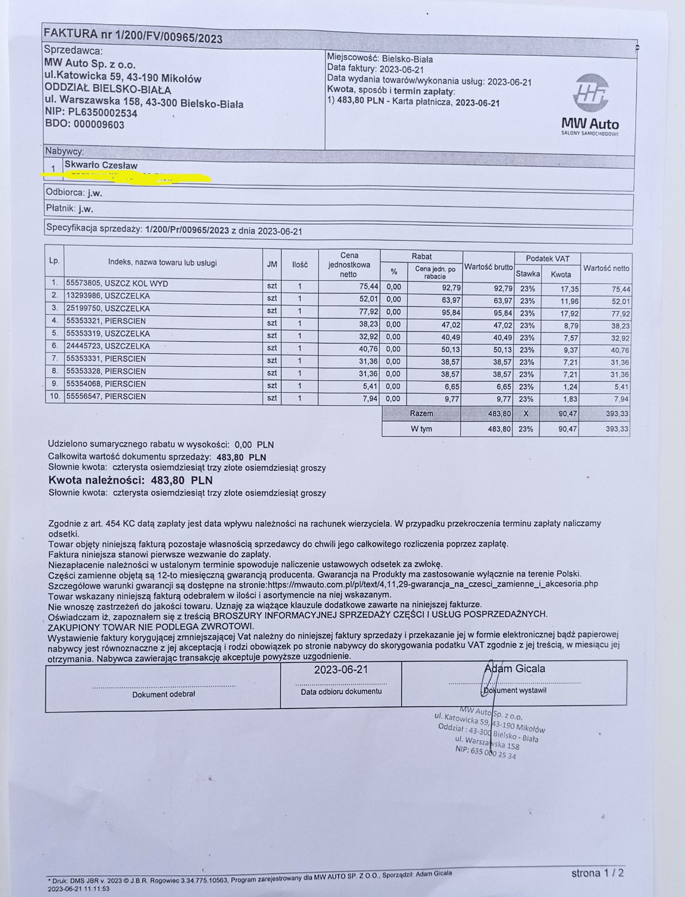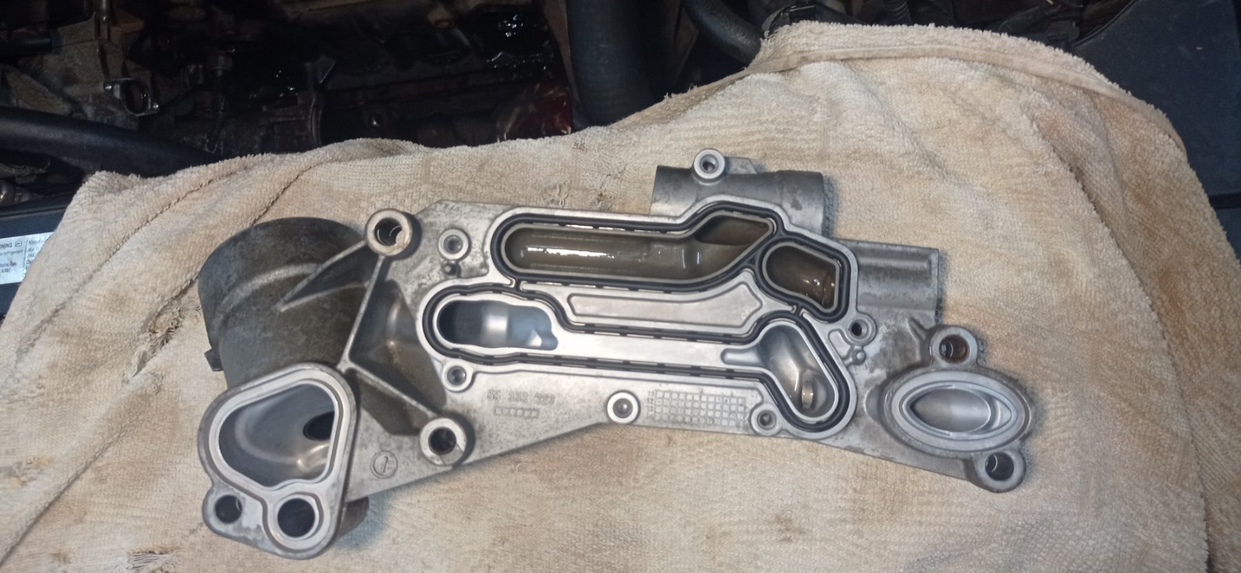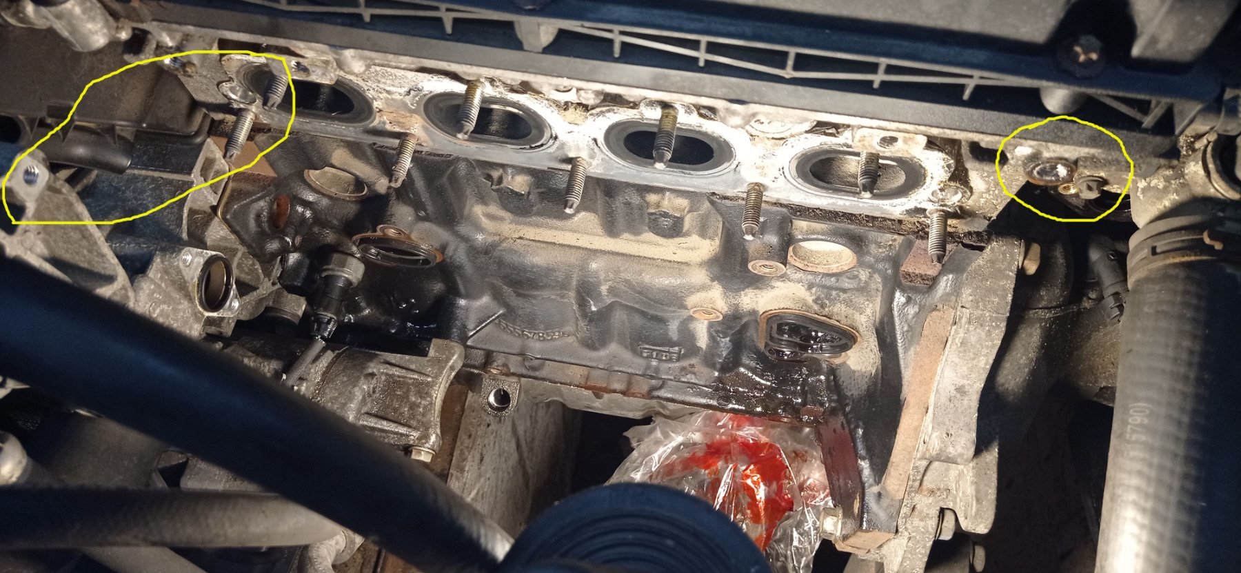 Po ściągnięciu plastykowej osłony dolnej po stronie pasażera odnajdziemy zawór do spuszczania płynu chłodniczego. Najlepiej odkręcić u góry korek, założyć w odpowiednim miejscy wężyk (na zdjęciu wężyk już założony, chyba 10 mm) i można odkręcić zawór (czasem stawia opór ale radzę go spróbować odkręcić rękoma). Nie wiem jak u innych ale u mnie bardzo mocno siedziała na oringu prowadnica bagnetu olejowego. Bałem się ze może jednak jest jeszcze gdzieś przykręcona na dole, ale w końcu się poddała (w drugą stronę też stawiała opór ale już mniejszy). Kiedy zdejmiemy osłonę katalizatora, odkręcimy kolektor od wydechu, warto przed demontażem kolektora odkręcić uchwyt silnika (zdjęcie poniżej) ułatwi to wyciągnięcie kolektora. Na zdjęciu zaznaczone jeszcze nakrętki kolektora (9 szt. z czego 2 już zdemontowane). Po wyciągnięciu kolektora możemy zobaczyć oznaczenie i nr seryjne silnika (choć pewności nie mam - może ktoś potwierdzi lub sprostuje). Odkręcamy chłodnicę oleju (5 śrub głównych, po 2 przy termostacie i pompie) wyciągami rozbieramy samą chłodnice (6 śrub), czyścimy dokładnie, wymieniamy uszczelki w samej chłodnicy na oryginalne i skręcamy z odpowiednimi momentami dokręcania 8 nm (skręcamy najlepiej odśrodkowo na zewnątrz lub przynajmniej na krzyż i nie dokręcajcie pojedynczych śrub do oporu tylko każdą stopniowo aby naprężenia rozchodziły równomiernie) ja, jako że miałem podobną awarię do tych powyżej, uszczelka pada w tym samym miejscu, zaryzykowałem eksperymentalnie dokręcenie śrub z momentem 10 nm. Może to coś da, może nic, może będę musiał poprawiać na wiosnę