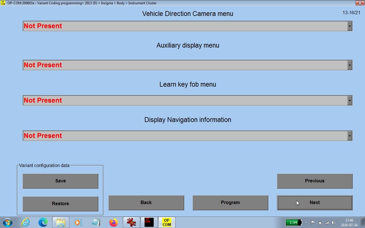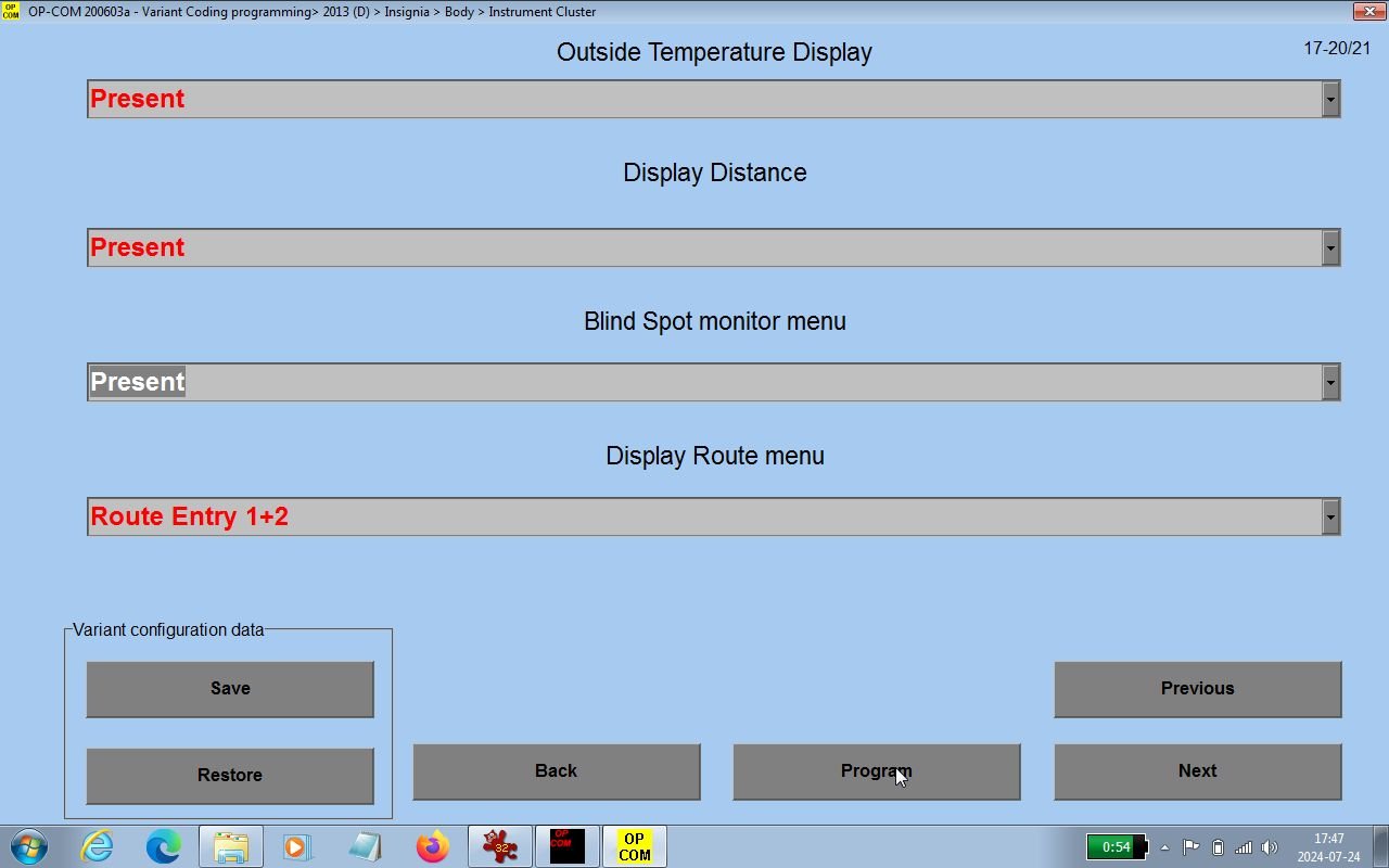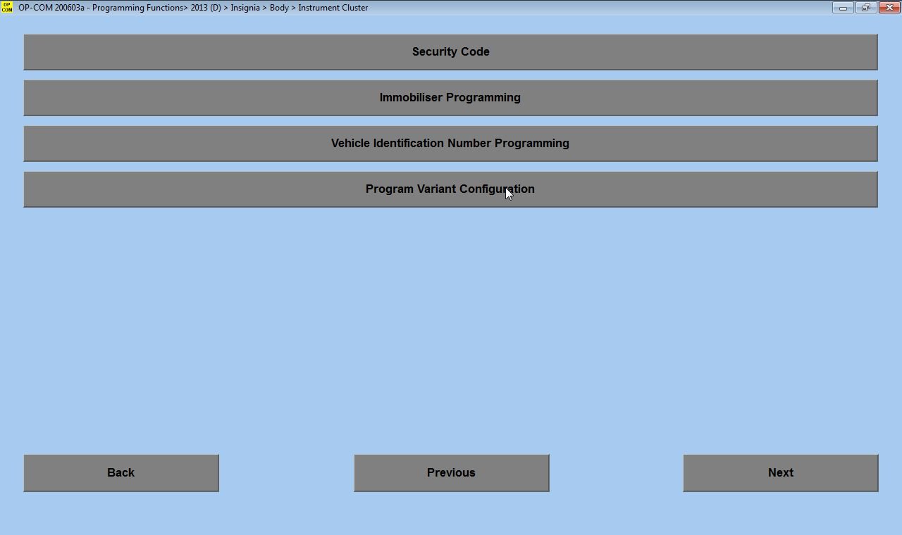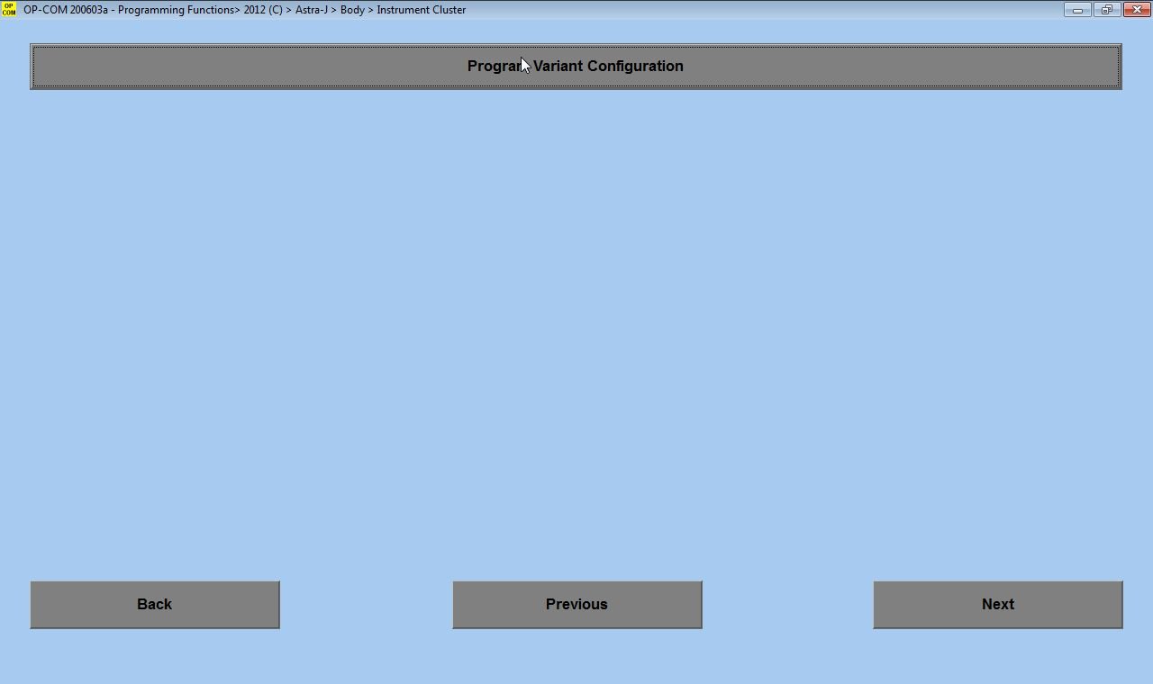 Czasami żeby przeprowadzić powyższą procedure trzeba najpierw na pierwszym ekranie wejść w "Diagnostics", cofnąć się i dopiero wejść w "Settings". 5. Jeśli wszystko jest OK to cofamy się do pierwszego ekranu i wybieramy "Diagnostics" 6. Wybieramy interesujący nas rocznik, w moim przypadku był to 2013 7. Wybieramy "Insignie" 8. Następnie "Body" 9. I "Instrument Cluster" 10. Wybieramy którąś z wersji interfejsu 11. Czekamy na połączenie i wybieramy "Programming" 12. Teraz "Program Variant Configuration" 13. I mamy możliwość wyboru poszczególnych zakładek, "Present" to włączona "Not Present" to wyłączona, przyciskami "Previous" i "Next" przełaczami pomiędzy kilkoma zbiorami. 14. wybieramy interesującą nas zakładkę, zmieniamy jej status i klikamy "Program" 15. Potwierdzamy 16. Po otrzymaniu takiego komunikatu cala procedura jest zakończona i wybrane zakładki powinny być aktywne, możemy je przetestować na liczniku.