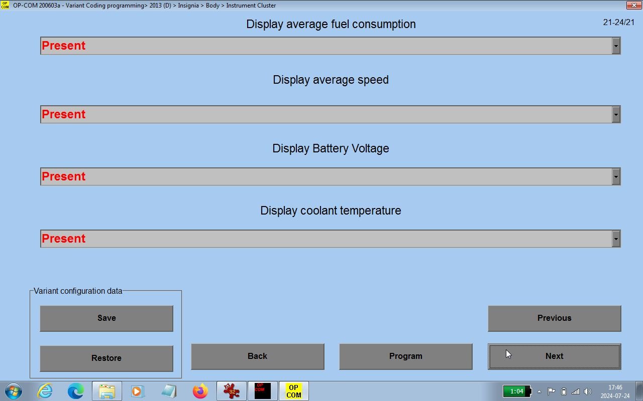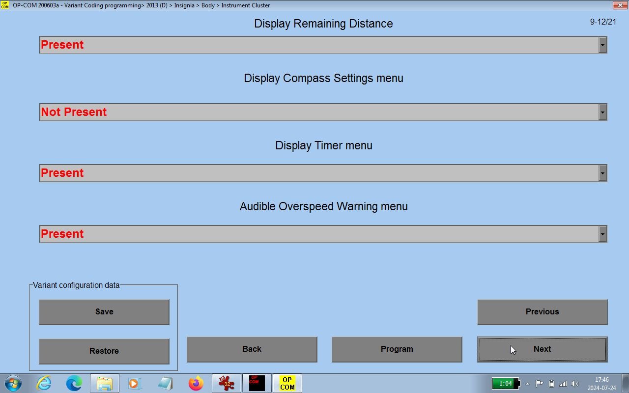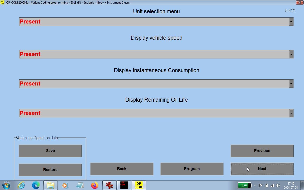 Czasami żeby przeprowadzić powyższą procedure trzeba najpierw na pierwszym ekranie wejść w "Diagnostics", cofnąć się i dopiero wejść w "Settings". 5. Jeśli wszystko jest OK to cofamy się do pierwszego ekranu i wybieramy "Diagnostics" 6. Wybieramy interesujący nas rocznik, w moim przypadku był to 2013 7. Wybieramy "Insignie" 8. Następnie "Body" 9. I "Instrument Cluster" 10. Wybieramy którąś z wersji interfejsu 11. Czekamy na połączenie i wybieramy "Programming" 12. Teraz "Program Variant Configuration" 13. I mamy możliwość wyboru poszczególnych zakładek, "Present" to włączona "Not Present" to wyłączona, przyciskami "Previous" i "Next" przełaczami pomiędzy kilkoma zbiorami. 14. wybieramy interesującą nas zakładkę, zmieniamy jej status i klikamy "Program" 15. Potwierdzamy 16. Po otrzymaniu takiego komunikatu cala procedura jest zakończona i wybrane zakładki powinny być aktywne, możemy je przetestować na liczniku.