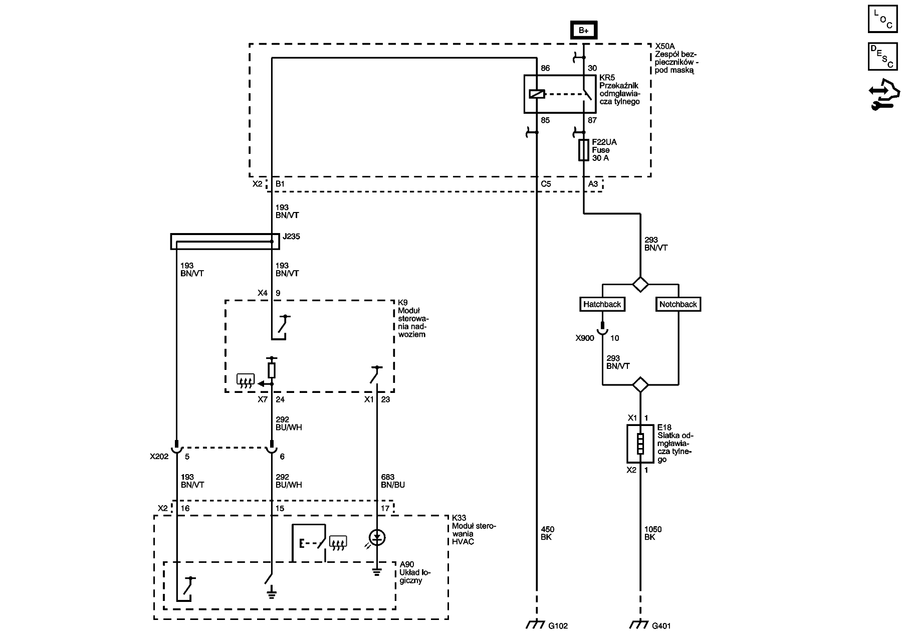 Pacjent Aveo T300 benzyna, sedan. Objaw - brak grzania tylnej szyby. Przekaźnik 14 oraz bezpiecznik 15 w komorze silnika sprawdzone - sprawne. Napięcia na zaciskach szyby brak. Rezystancja między pinami szyby 0,6ohm, między lewym pinem a masą 0ohm, między prawym pinem a masą 0,4ohm. Gdzie dalej szukać?