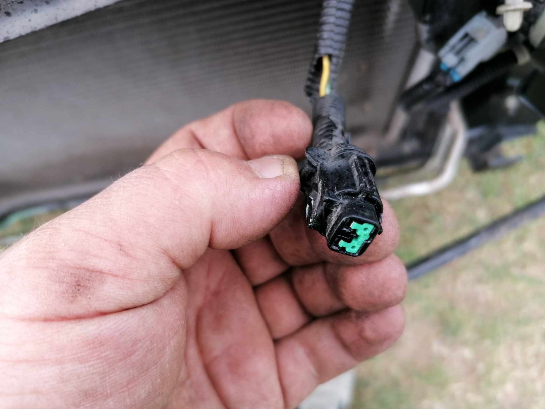 Zapewne w dolnej części zderzaka (możliwe że okolice halogenu) masz czujnik temperatury, który mógł się uszkodzić lub wypięła/urwała się wtyczka.