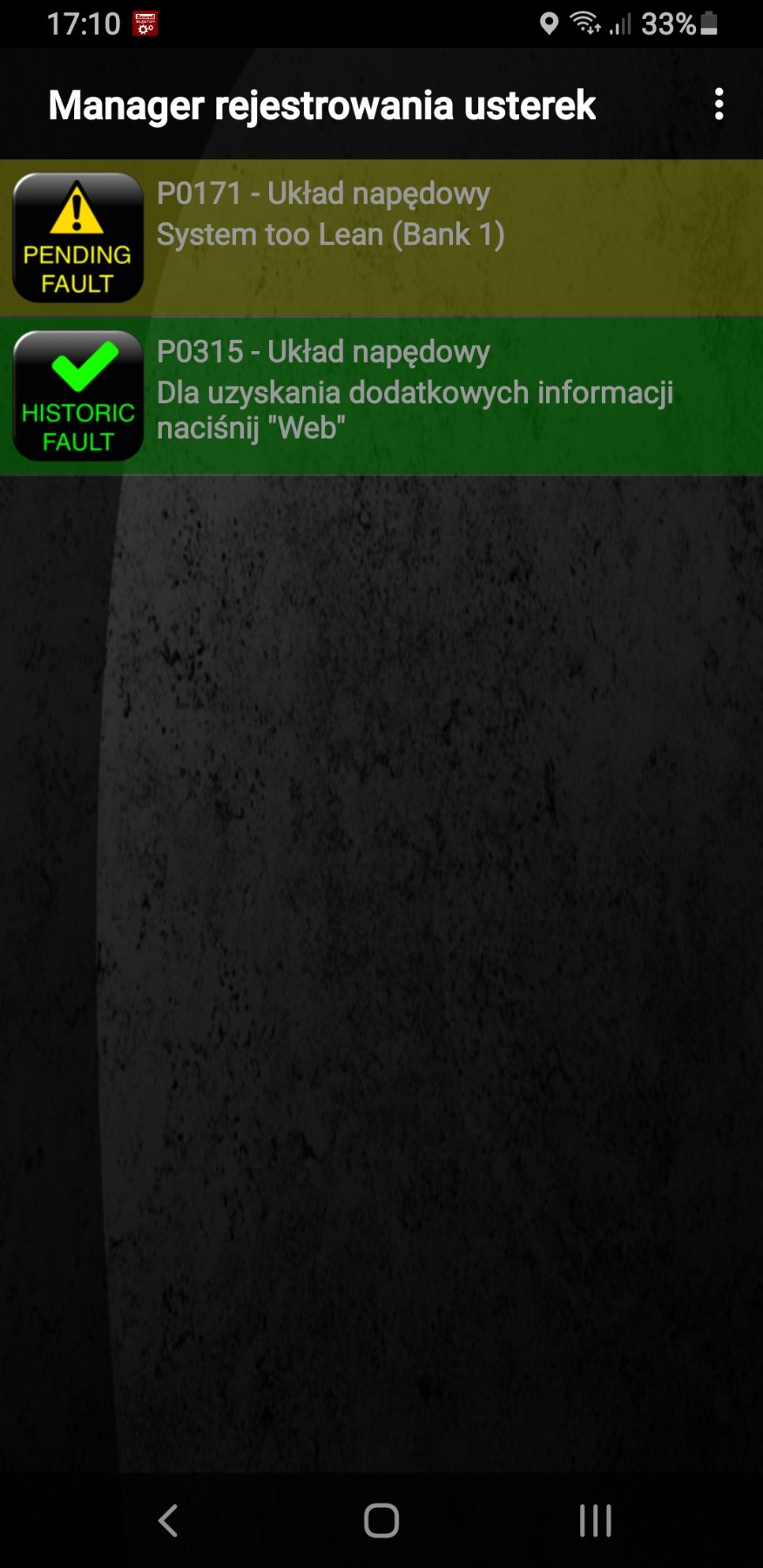 Mam tylko zapisane w dzienniku usterek dwa bledy. Niem mam wykonanych pomiarów dla sondy lambda.