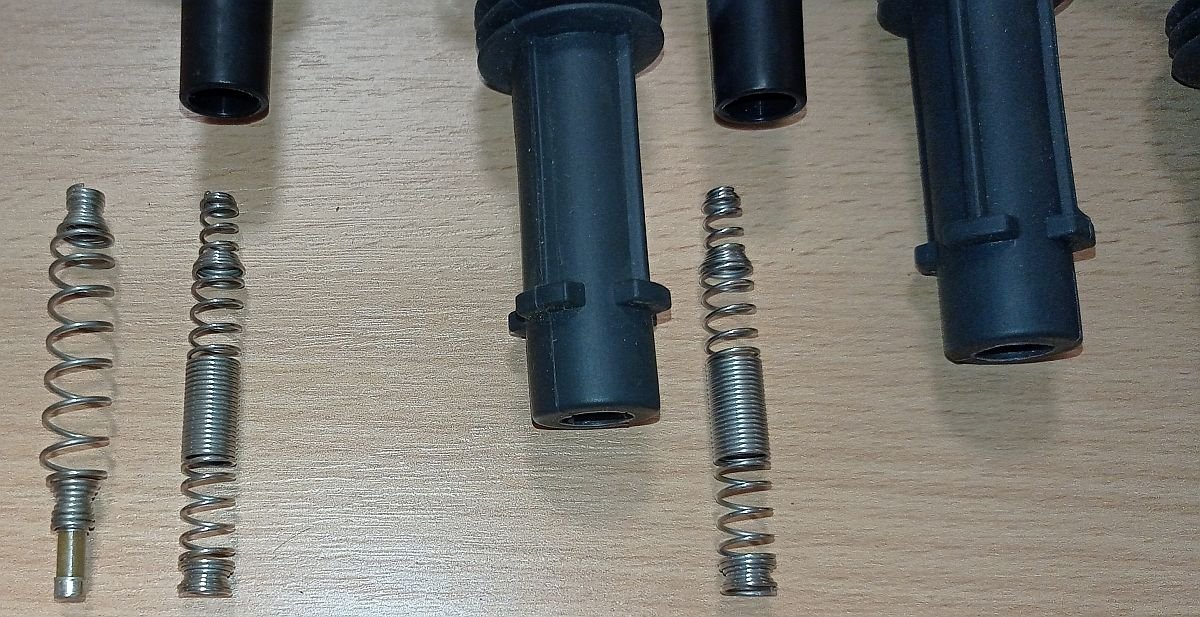 2. Sprężynki bez rezystorów. Oto tani moduł zapłonowy marki "noname": A to wyjęte z niego sprężynki. Dla porównania z lewej strony sprężynka z oryginalnego modułu: