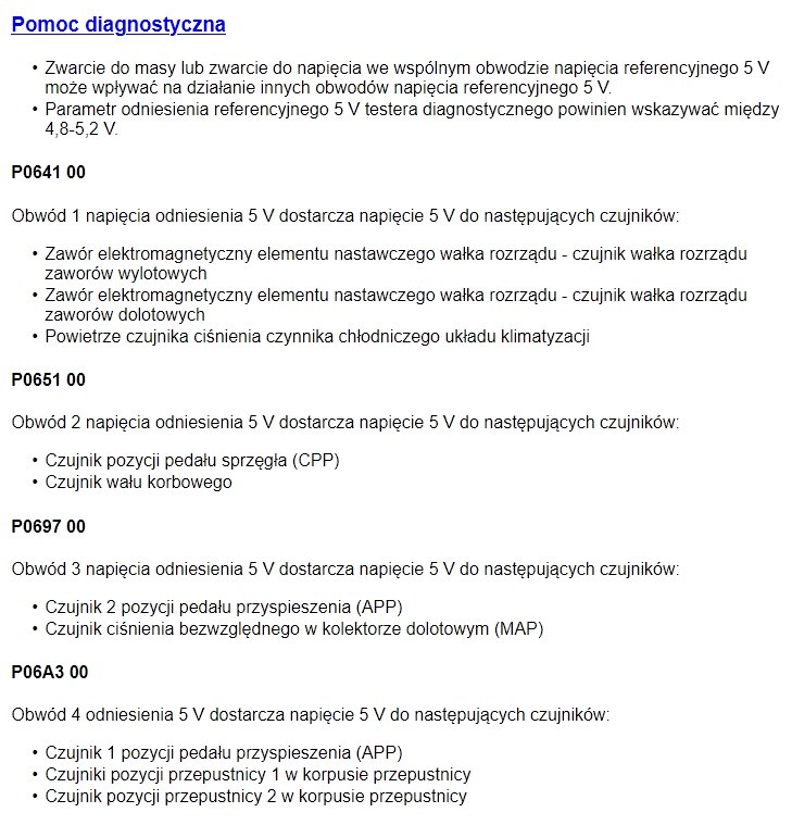 Według TIS taka kombinacja błędów może wskazywać na zwarcie w jednym z obwodów 5V (obwód numer 2):