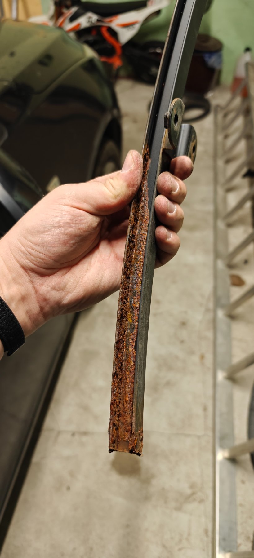 Żeby wyjąć słupki najpierw opuszczamy szybę, potem ściągamy boczki drzwi odkręcając śrubkę pod gumowa podkładką w podłokietniku a drugą za zaślepką we wnęce klamki wewnętrznej i następnie ciągniemy za ranty boczków żeby wyjąć je z kołkami. Byłem pewien że połamią się gniazda na kołki w boczku a połamały się same kołki. To nawet lepiej bo kołki dokupimy a gniazda na kołki trzeba kleić. Po tym jak odepniemy kołki po lewej i prawej stronie oraz na dole nie szarpiemy się z górną częścią boczku ponieważ nie ma tam kołków tylko haczyki wiec unosimy całość ku górze co powoduje że tapicerka jest ściągnięta. Odpinany kostkę z instalacją i linkę od klamki i odstawiamy boczek. Odkręcamy dwie śruby trzymające słupek. Jedna jest schowana za folią. Teraz musimy wyciągnąć z feralnego słupka uszczelkę od strony opuszczonej szyby. U mnie była taka rdza, że musiałem się nieźle przy tym natrudzić. Teraz musimy obniżyć słupek o jakiś 1cm żeby górną częścią wyszedł z uszczelki, przekręcić w lewo lub prawo, zależy z których drzwi go demontujemy i wyciągnąć do góry. Nie wiem jak będzie szło z ponownym montażem ale wydaje się mniej skomplikowane.
