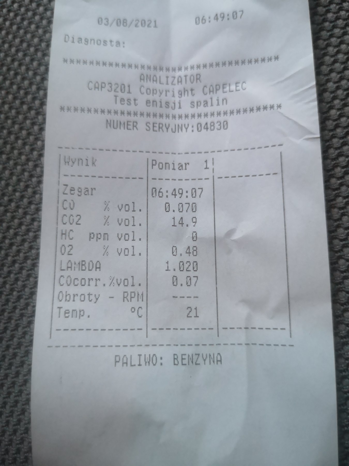 Zrobiłem test emisji spalin i wyszło że na wolnych obrotach wszystko jest Ok dopiero na podwyższonych jeden wskaźnik przekracza nieco normę.