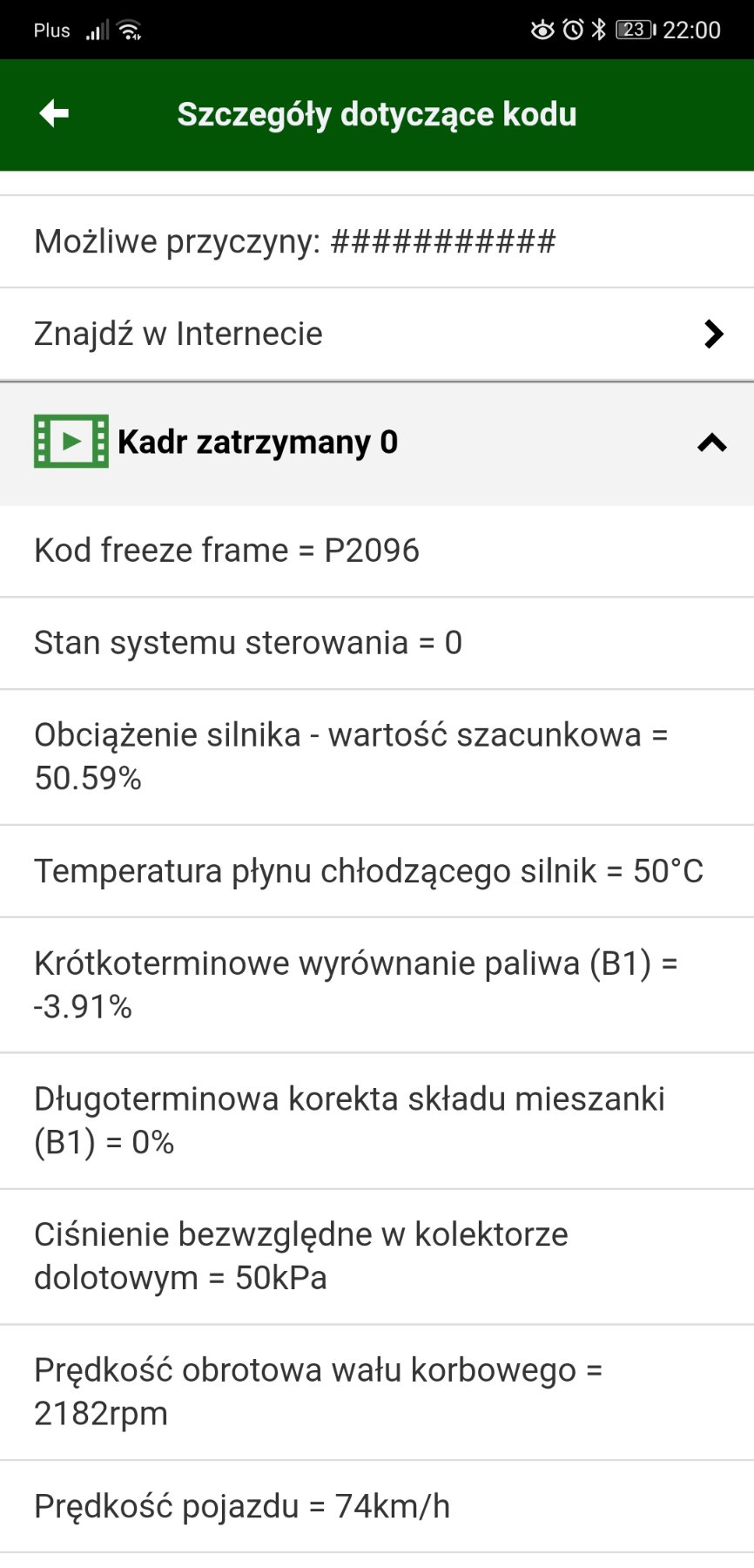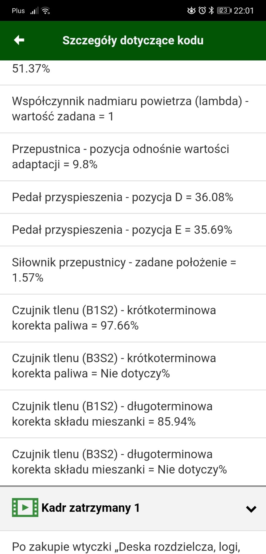 Przygotowuje się mentalnie do wydania kasy na nowy katalizator, jednak odkryłem w programie do kasowania błędów "stop klatkę" i zamieszcze wskazania może ktoś zobaczy tam coś co by wskazywało na inny problem niż katalizator. Dodam że kupiłem jakiś środek do czyszczenia katalizatora i nie pomogło, do tego zajrzałem od góry do kata i wygląda ok, jest cały i biały.