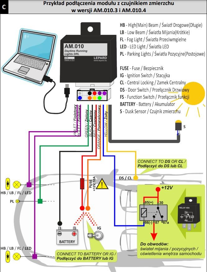 Kombinuje by ten układ nosiłoby chociaż znamiona zgodności z przepisami (DRL działają gdy nie są włączone mijania lub pozycyjne). Wiem, że ten układ nie odetnie zasilania dla pozycyjnych z tyłu ale to zostawiam na kolejny etap kombinowania. Ideałem byłoby posiadanie automatu, który sterowałby w zależności od zmierzchu (np. LEPARD AM.010.4 Moduł Świateł do Jazdy Dziennej DRL) ale brakuje mi wyobraźni jak go podłączyć by obszedł skandynawie.