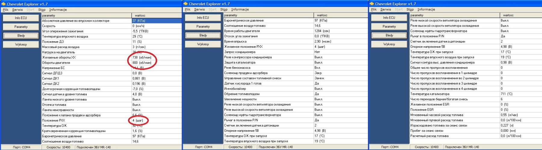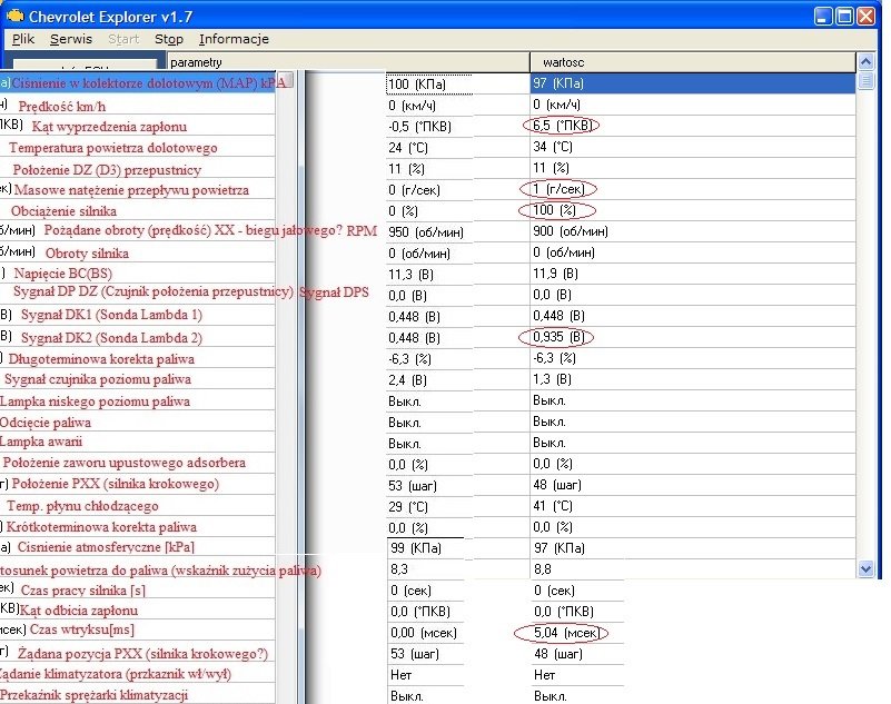 W załączniku dane parametrów 3 pierwsze prawidłowa praca.... z prawej strony brak wolnych obrotów i nie odpala, zaznaczam, że silnik nie pracuje, a wskazuje obciążenie silnika 100%