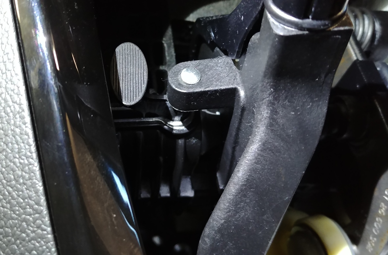 Przy skrzyni przy wybieraku jest podobnie ale zamiast wyciągać pin wpychamy go. Jest tam taki - nazwijmy go guzik - czarny, i należy go wcisnąć do samego końca. Trzeba nacelować = poruszać troszkę cięgłami, aby wszedł do końca. Dostęp do tego jest mega wkurzający ale nie tak jak później przy lewarku. Generalnie wysunąłem komputer do góry na tyle ile pozwoliły kable ( nie chciałem odpinać wtyczek bo się bałem, że coś zepsuje