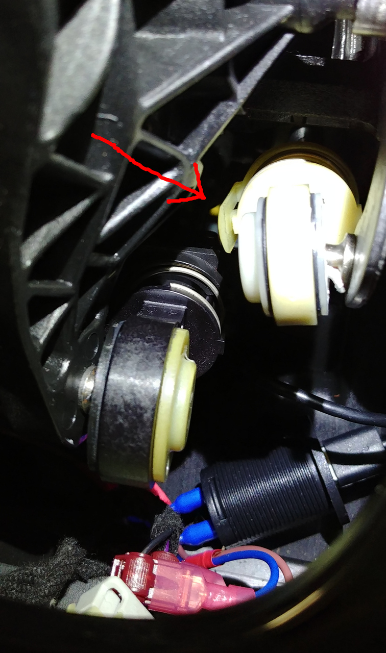 4. Wracamy do kabiny i odklikujemy uchwyty cięgieł - i tu uwaga! delikatnie z tymi zapadkami bo można złamać i potem będzie bieda przy ew. kolejnym ustawianiu. Mnie ta czarna nie chciała wrócić bo zaklinowała się z takimi niebieskimi plastikami trzymającymi cięgło. Zamiast sposobem walczyłem na siłę i złamałem ten plastik z zatrzaskiem i teraz jak mi przyjdzie ustawiać to będę miał problem. Potem płaskim śrubokrętem nakierowałem te niebieskie plastiki i zatrzasnęło się samo.