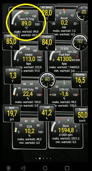 Wczoraj zmieniłem olej w skrzyni i chciałem też sprawdzić jego poziom. Udało mi się odczytać temperaturę ATF'u Car Scannerem w wersji bezpłatnej, także jakby ktoś potrzebował, to polecam spróbować tą apką.