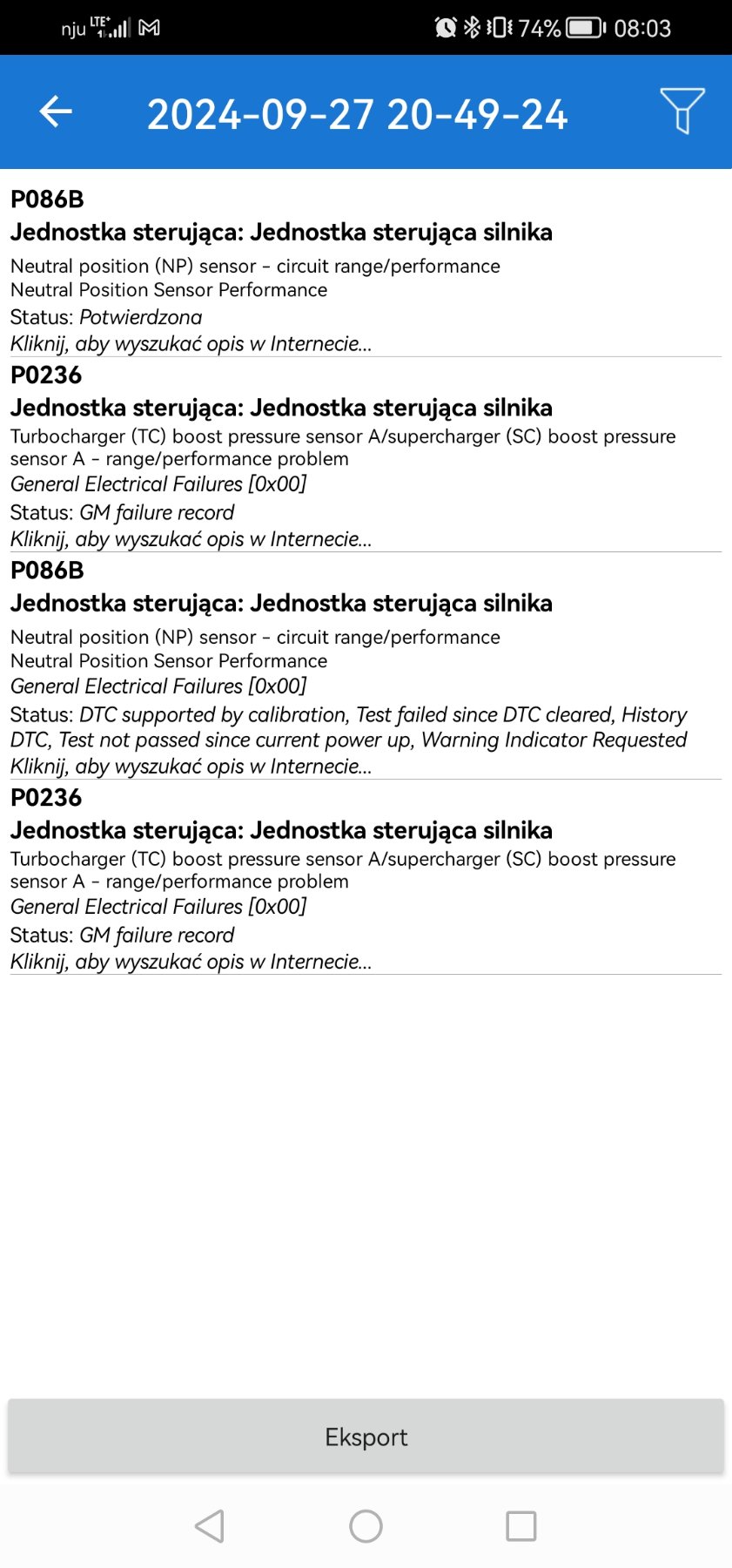 Witam mam pytanie odnośnie błędy P0236. W załączniku załączyłem screen błędów po diagnostyce. Pytam bo pojawila mi się dzisiaj kontrolka silnika. Zrobiłem diagnostykę- Błąd 086 jest jako potwierdzony. Temat tego błędu znam pojawia mi się co jakiś cas (co ok 3 miesiące), ale błąd P0236 jest nowością. Czy jest to jakaś usterka czujnika? Czy moze historycznie pojawił się raz problem z tym ale ogólnie jest ok? , mam prośbę o radę. Po skasowanie błędów narazie nie wyskakuje, zobaczymy jak będzie po codziennym użytkowaniu