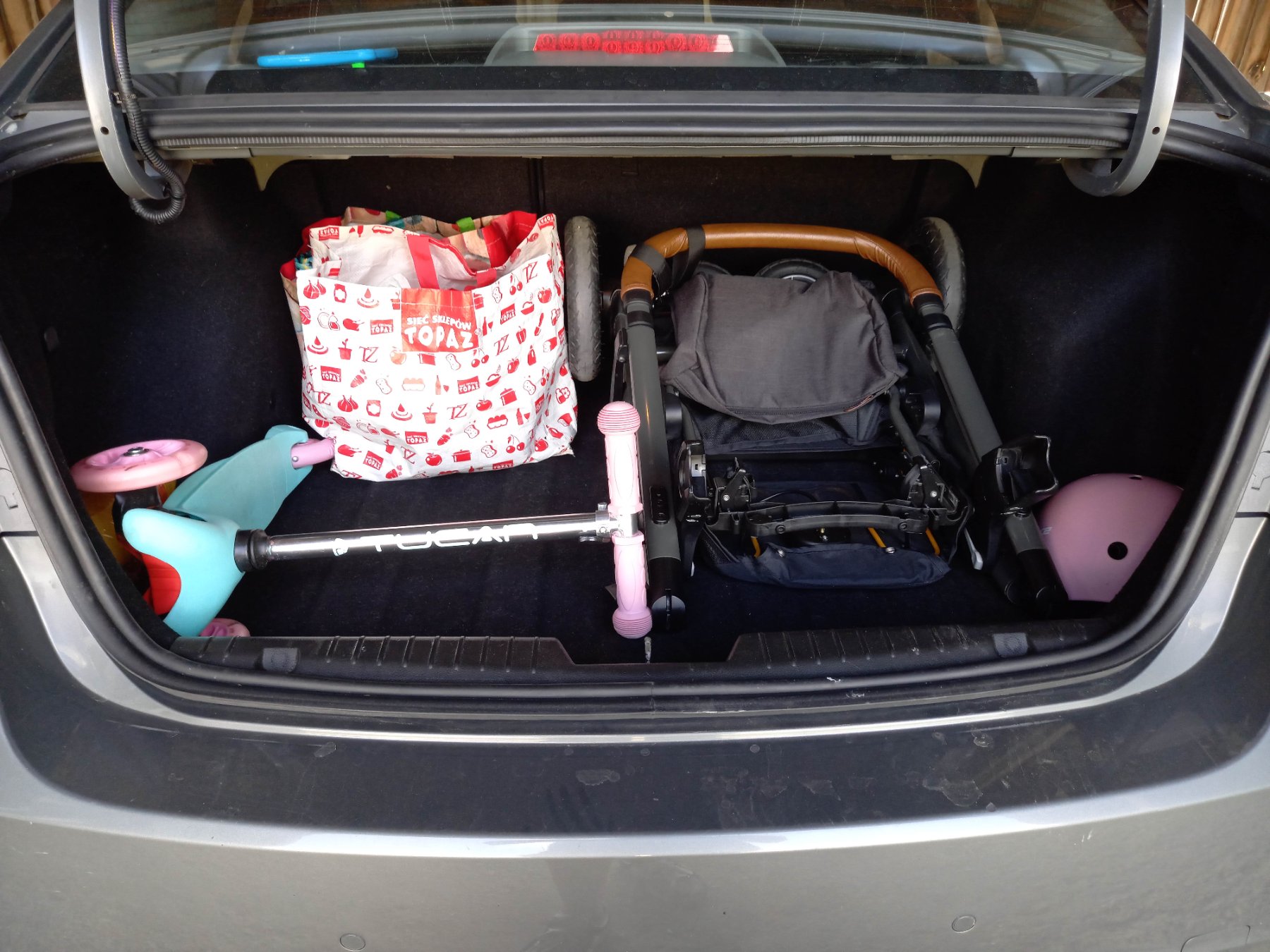 . Do bagażnika wózek gondola wchodził bez problemu z parasolką też ich nie miałem , więc można powiedzieć że auto max dla 4 osobowej rodziny jest ok