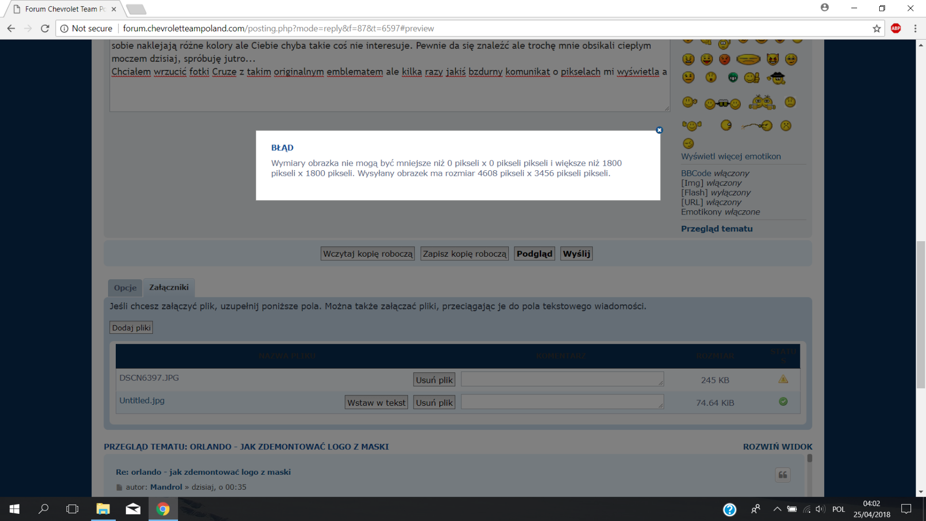 Chciałem wrzucić fotki Cruze z takim originalnym emblematem ale kilka razy jakiś bzdurny komunikat o pikselach mi wyświetla a fotka ma 245KB i 910x678 pixeli... Oszukałem gada, dało się w inny sposób