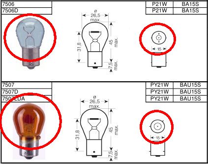 PY21W są żarówkami o bańce żółtej a P21W są przezroczyste. Są wzajemnie niezamienne ze względu na odmienne położenie wypustek ustalających na cokole. Żarówki o bańce żółtej są najczęściej używane pod przezroczyste klosze.