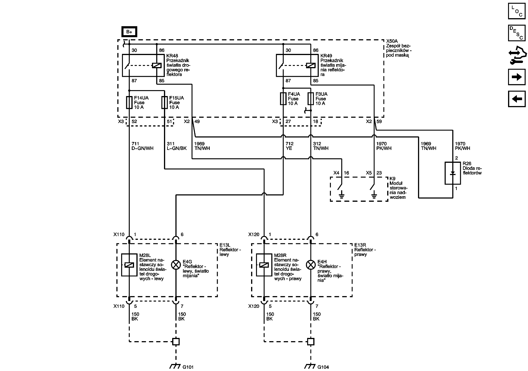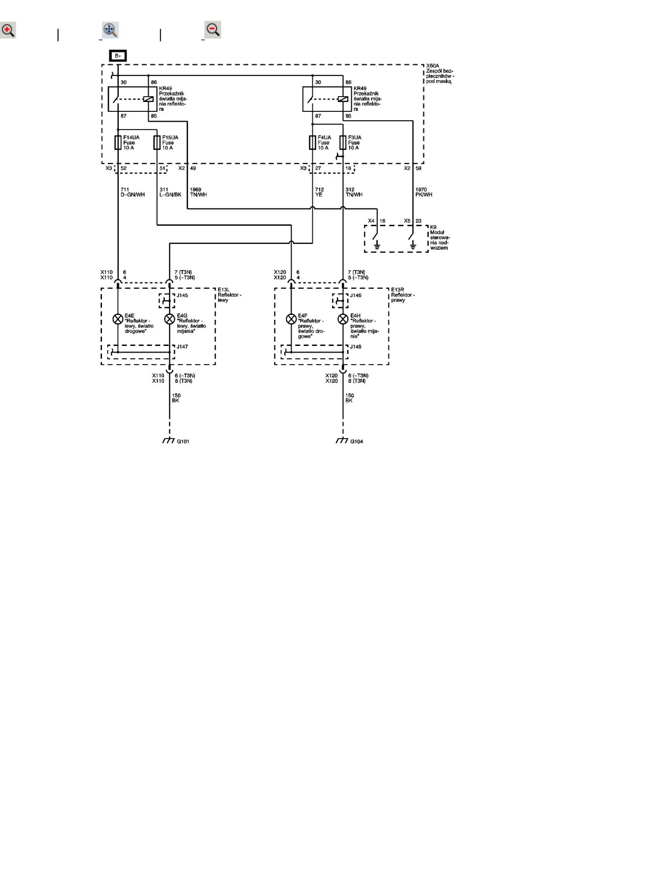Na schemacie jest błąd. Dwa razy jest KR49 od świateł mijania...