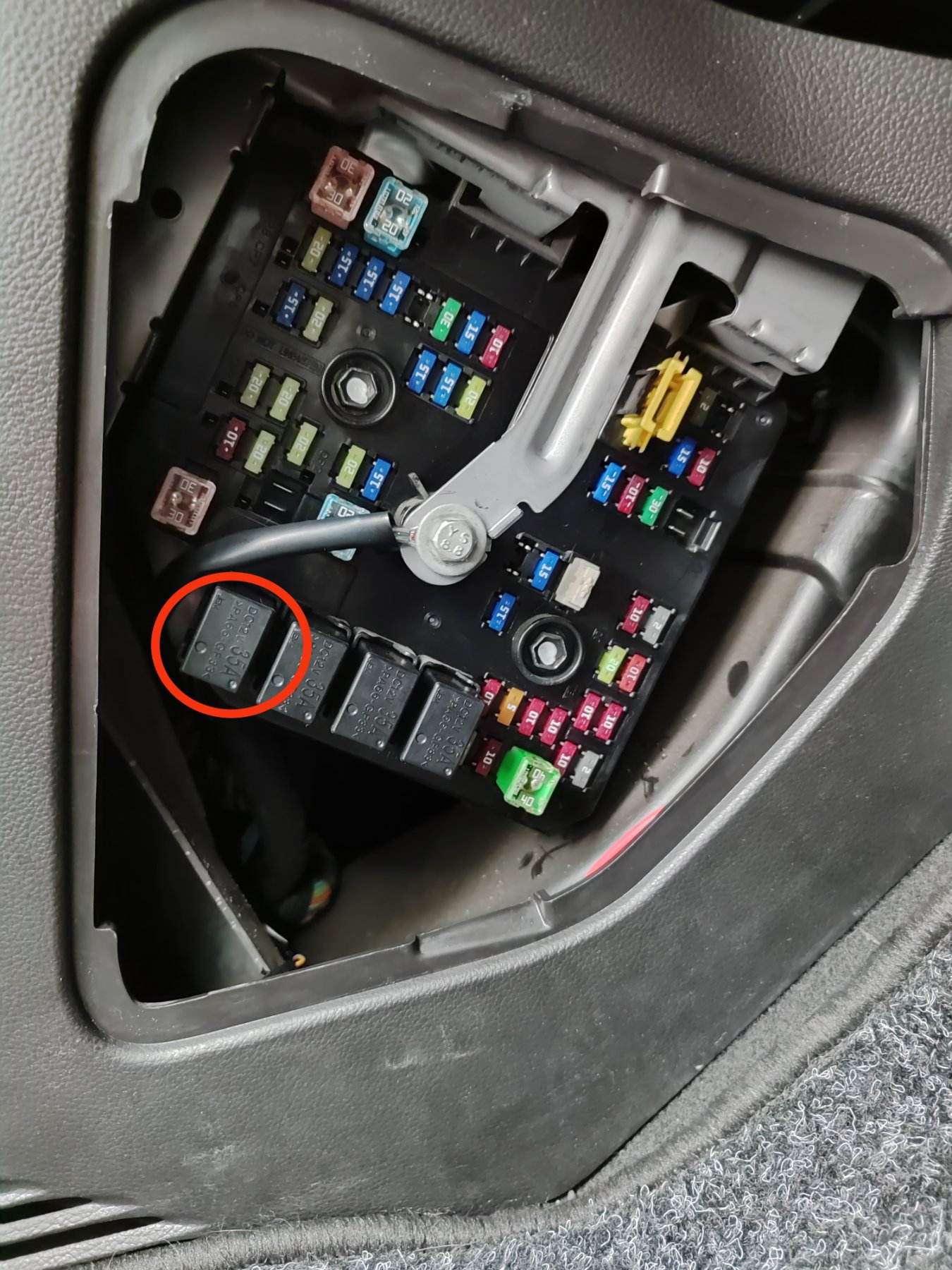 Bezpieczniki całe z wyjątkiem tego białego, po podmianie na zwykły 20A auto odpaliło ale nie mogłem zgasić. Przekaźnik ma przejście, radio też przemówiło ale przekaźniki wydają dziwne dźwięki więc dłużej nie eksperymentowałem. Skrzynka wymontowana, poszła do elektryka.