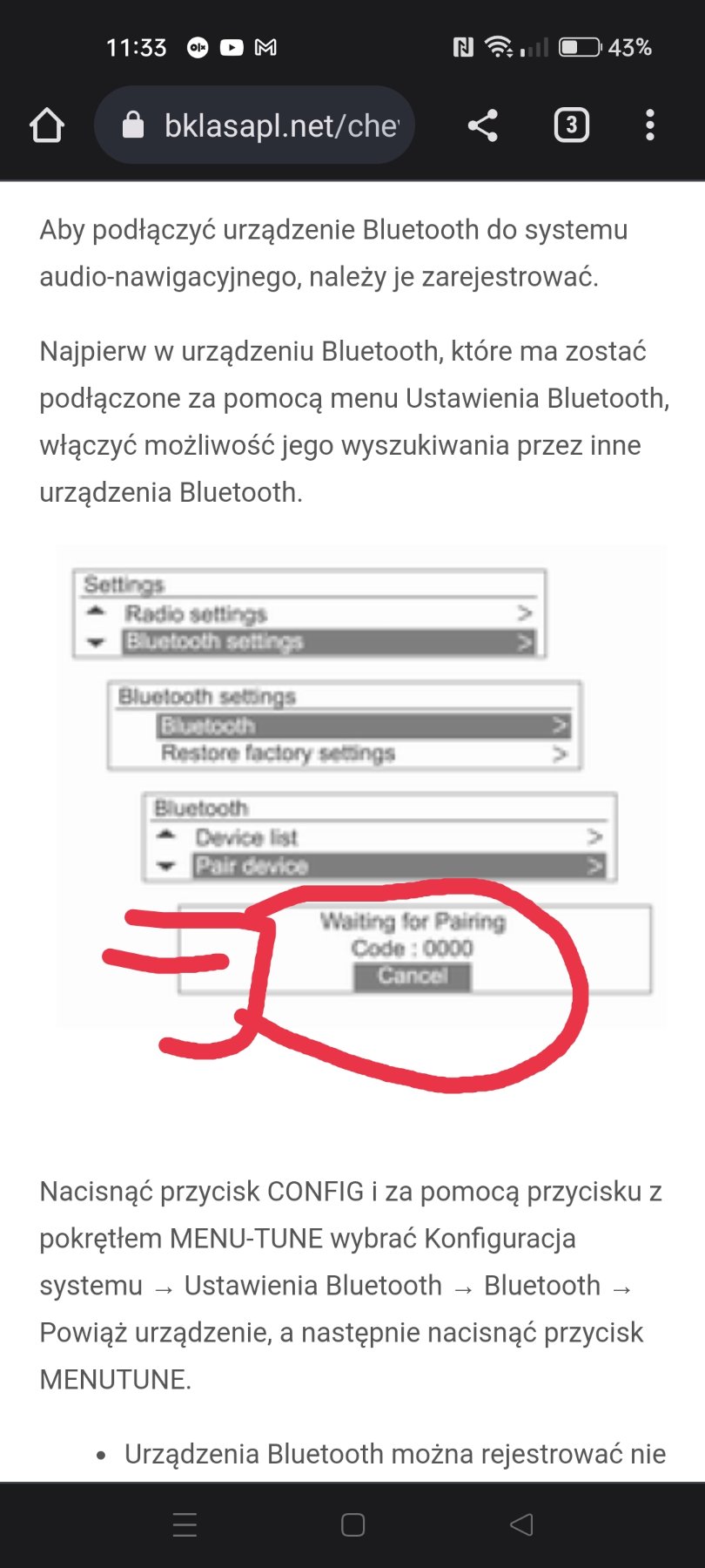 Mam problem z połączeniem Bluetooth telefonu z radiem. Żaden telefon nie wyszukuje radia chociaż w radiu zostało włączone bluetooth. Zauważyłem jeszcze że przy próbie parowania przez radio nie wyświetla się kod na radiu.