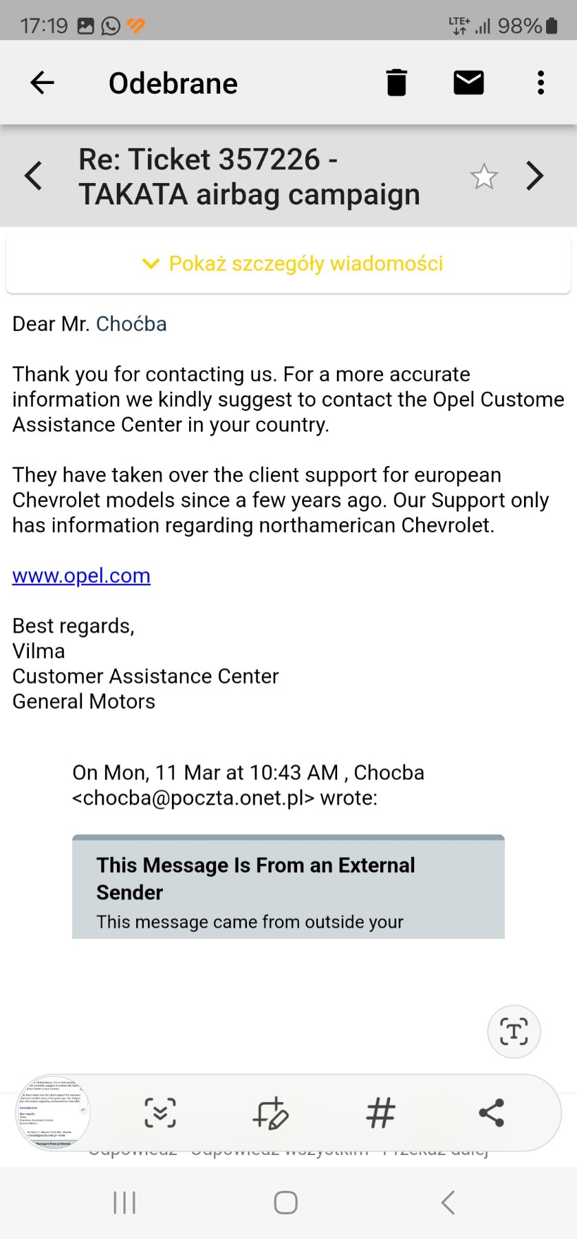 Czyli GM odbija piłeczkę w stronę serwisu Opla który to znowu twierdzi że o niczym nic nie wie