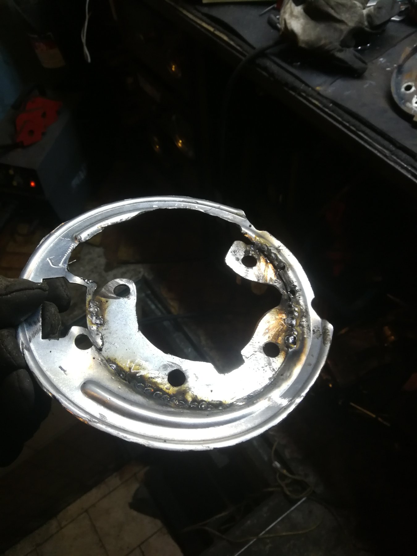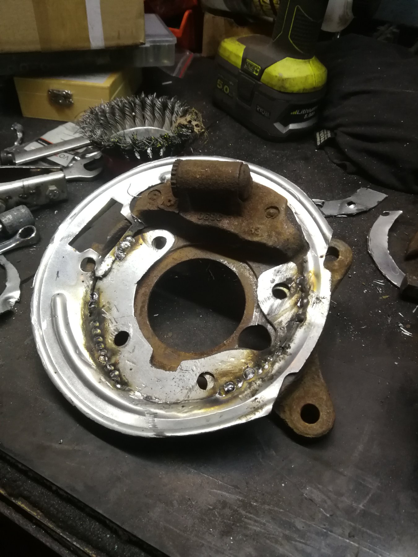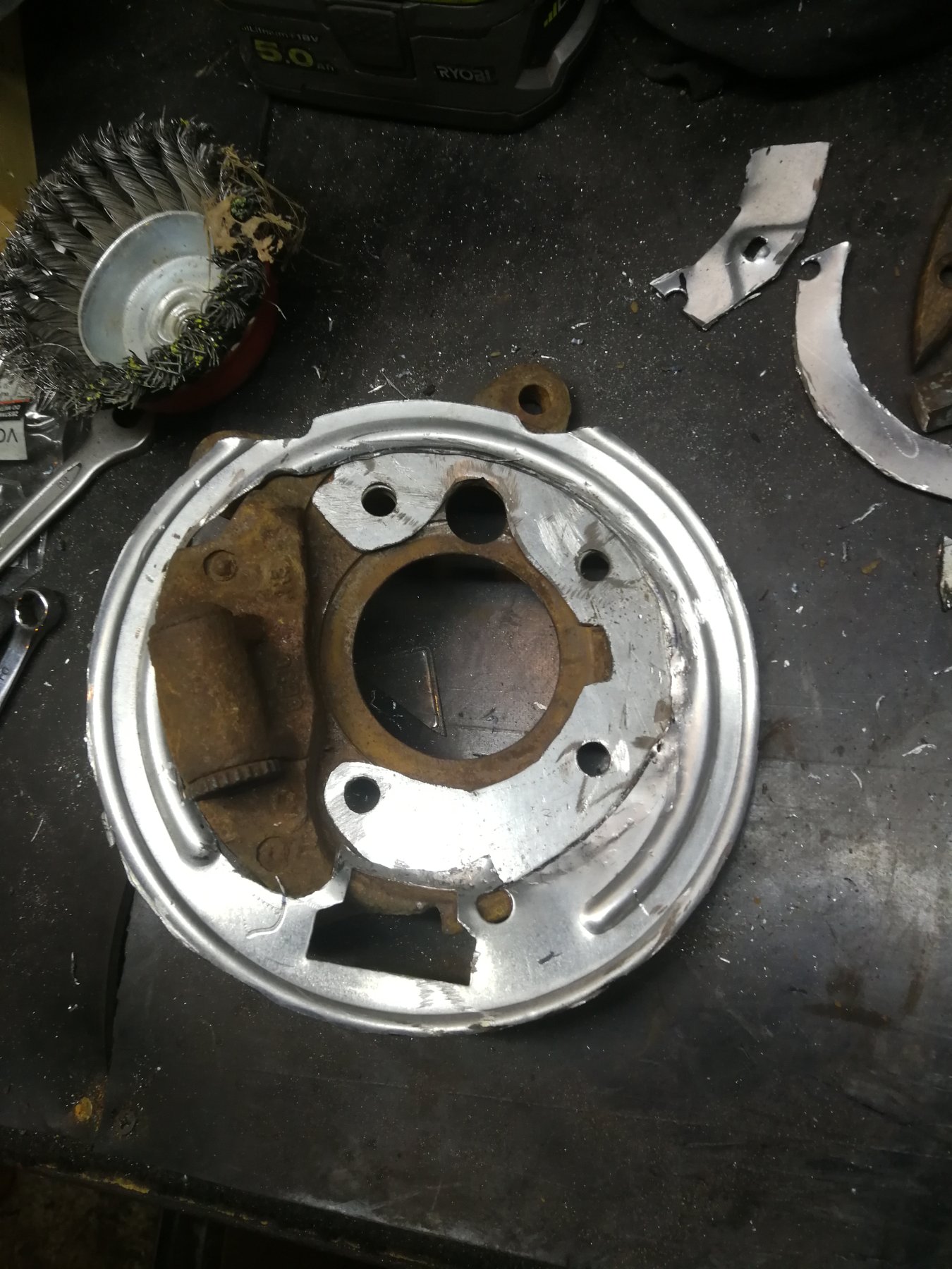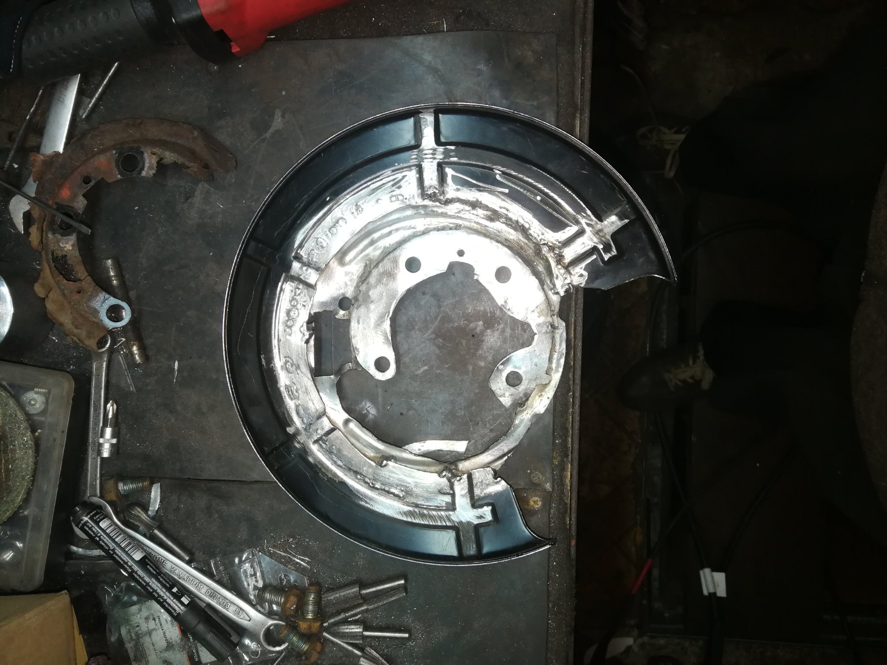 Do odtworzenia tarczy kotwicznej użyłem osłony z e46. Jest co prawda większa, ma tam taką dziurę na cylinderek, więc po wycięciu flanszy pod leganze został taki otwór -> nie chciałem się już bawić z zaklejenie go, bo to nie pokaz mody. Swoją robotę spełnia.